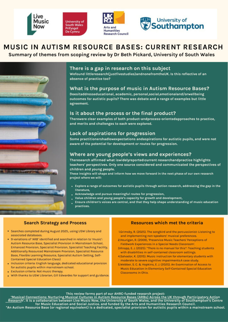 The first phase of the project involved Dr. Beth Pickard reviewing existing research related to music provision in Autism Resource Bases across the UK. Here is a summary of the scoping review, which highlights the lack of research on this subject.